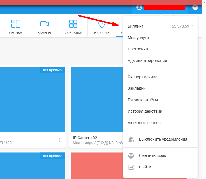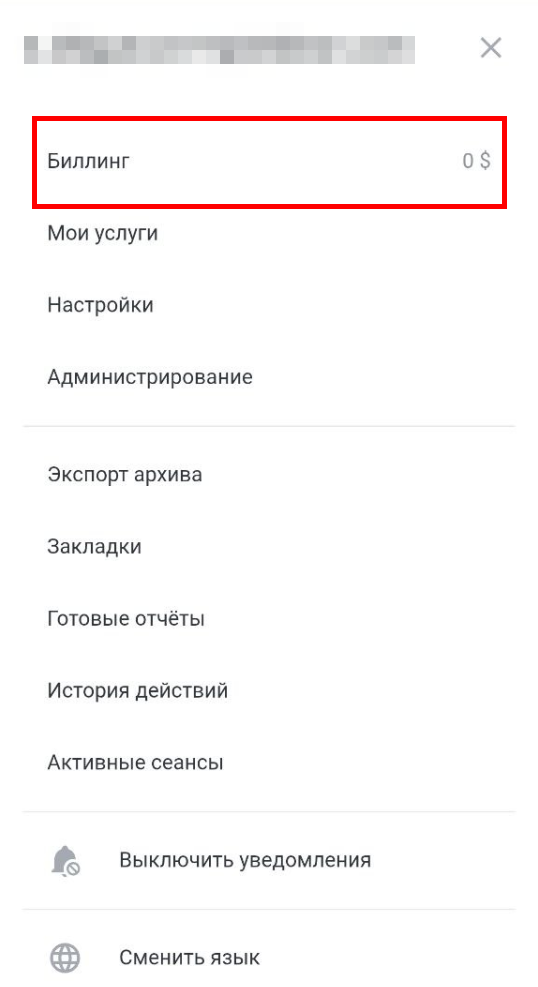 1. Щелкните по e-mail аккаунта в правом верхнему углу страницы личного кабинета и в выпадающем меню выберите Биллинг. | ![]() |