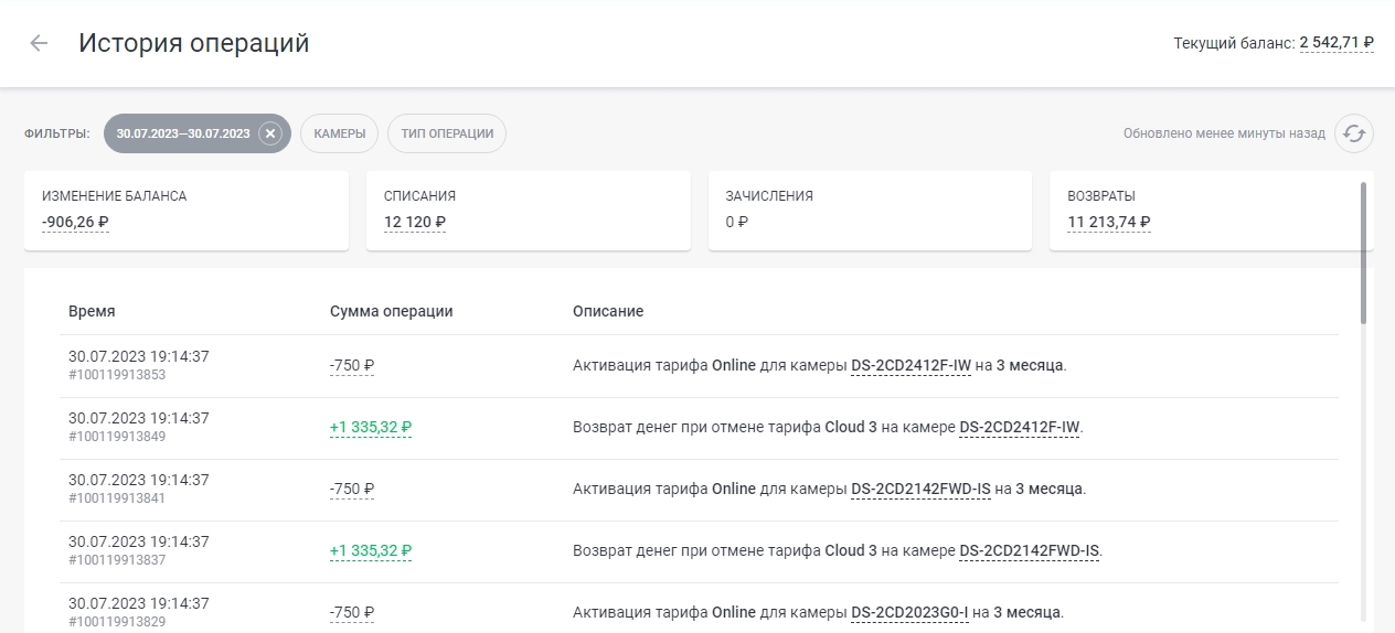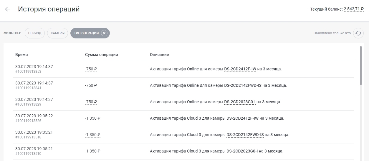 3. Фильтр Тип операции позволяет вывести информацию только по конкретным типам операций в аккаунте (пополнение счёта или покупка ключей активации для камер, например) | ![]() |