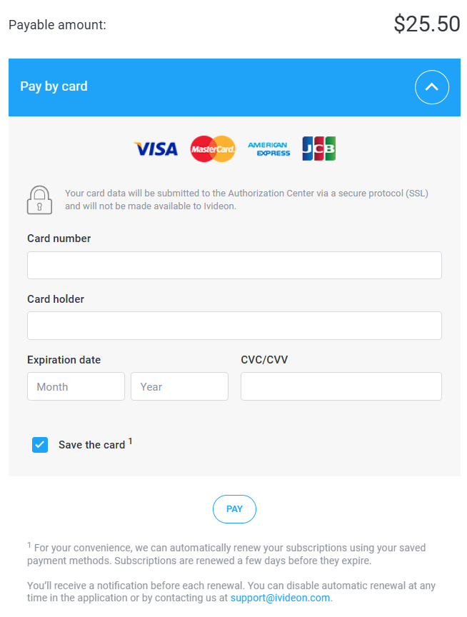 6. Choose one of the available payment methods, fill in the fields and press Pay. Please note! If you pay by card, you'll be prompted to Save card. It will then be used for automatic renewals. You’ll receive a notification before each renewal. You can disable automatic renewal at any time in the application or by contacting us at support@ivideon.com. Promo codes can be obtained when ordering from our online store, purchasing at retail stores, or in Ivideon email newsletters. | ![]() | ![]() ![]() |