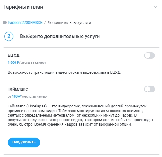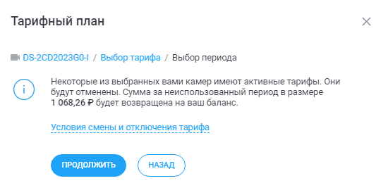 4. При изменении тарифа на новый, текущий тариф будет отключен от камеры, а на баланс вашего аккаунта будут возвращены денежные средства за неиспользованный период. Подробнее об условиях возврата вы можете прочитать в этой статье. Для продолжения смены тарифа нажмите Продолжить. | ![]() | |