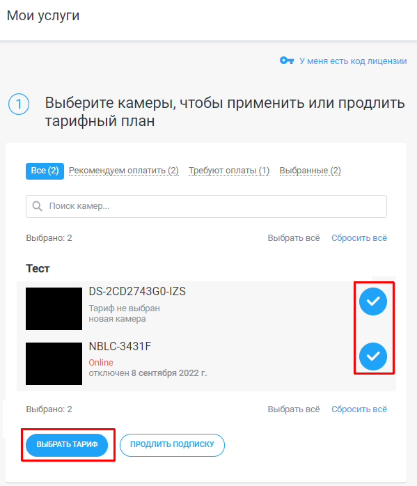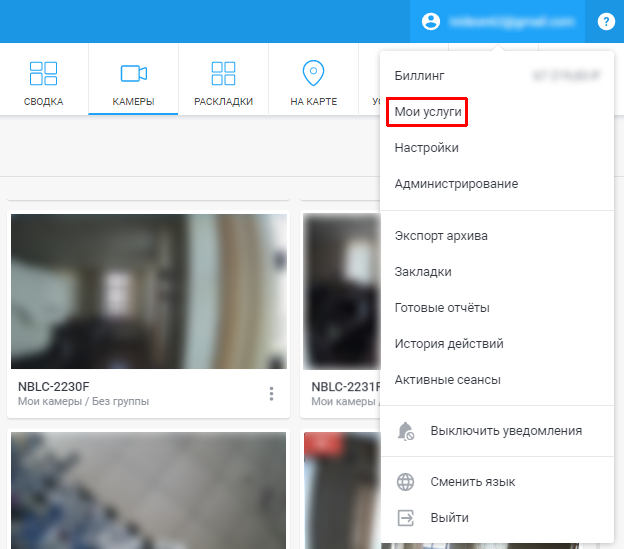 1. Если вам необходимо изменить тариф для одной камеры, в разделе Камеры нажмите кнопку настроек в виде трёх точек под превью камеры и в выпадающем меню выберите Тарифный план. Затем нажмите Выбрать тариф. Если вам необходимо изменить тариф для нескольких камер сразу, щелкните по e-mail аккаунта в правом верхнему углу страницы личного кабинета и в выпадающем меню выберите Мои услуги. Затем отметьте галочками нужные камеры и нажмите Выбрать тариф. |