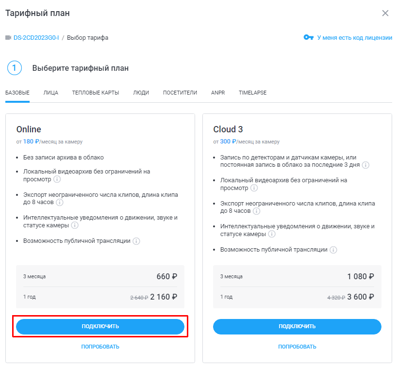 2. Выберите нужный тарифный план и нажмите Подключить. Тарифы видеоаналитики доступны для подключения на соответствующих вкладках. | ![]() | |