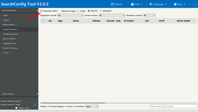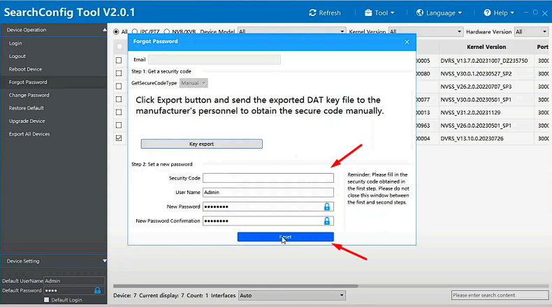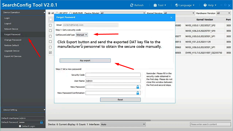 Если утерян пароль от веб-интерфейса камеры, его можно восстановить, обратившись в техническую поддержку Ivideon. Для восстановления пароля необходимо получить код устройства в виде файла с расширением .dat. Он генерируется с помощью специальной утилиты SearchConfigTool (имеется как для Windows, так и для MacOS) по следующей инструкции: